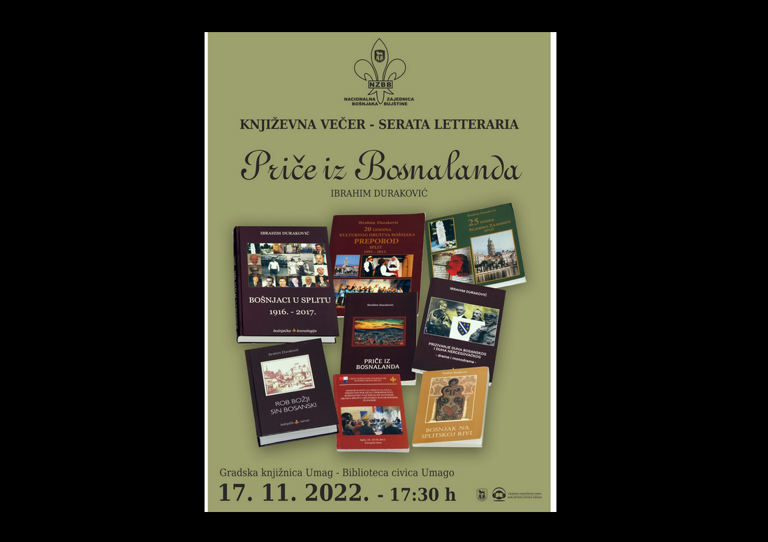 Giovedì, 17 novembre 2022, alle ore 17:30, presso la Biblioteca civica di Umago la Comunità nazionale dei Bosniaci del Buiese organizza l’incontro con lo scrittore Ibrahim Duraković di Spalato. Questa sarà l’occasione per il pubblico umaghese di conoscere il repertorio culturale e letterario dello scrittore. Benvenuti!